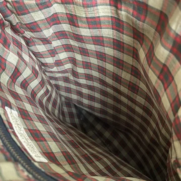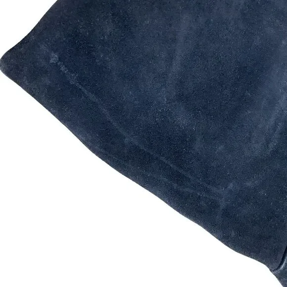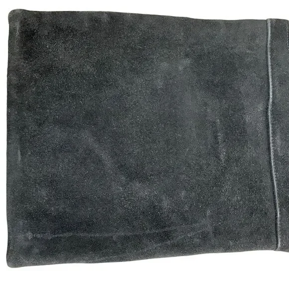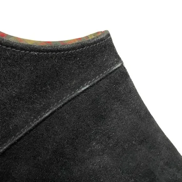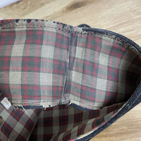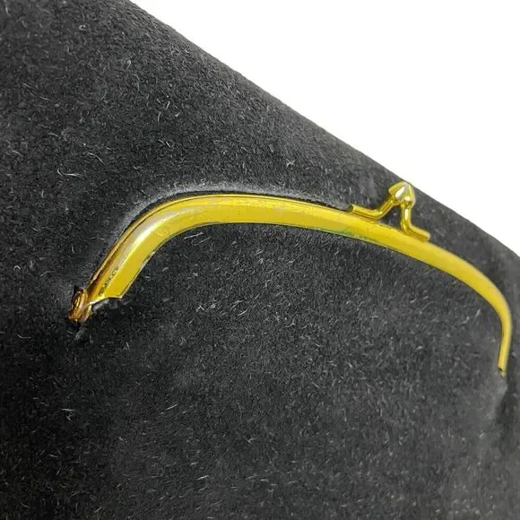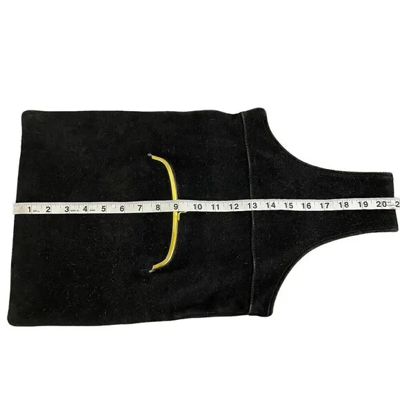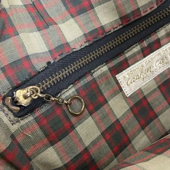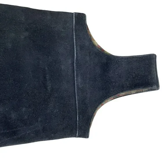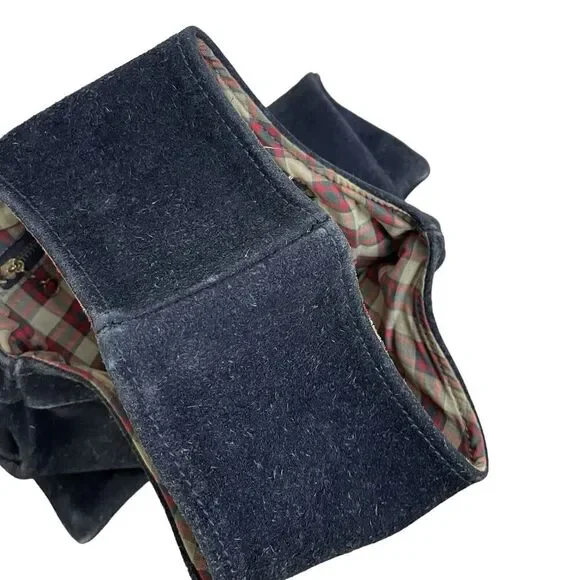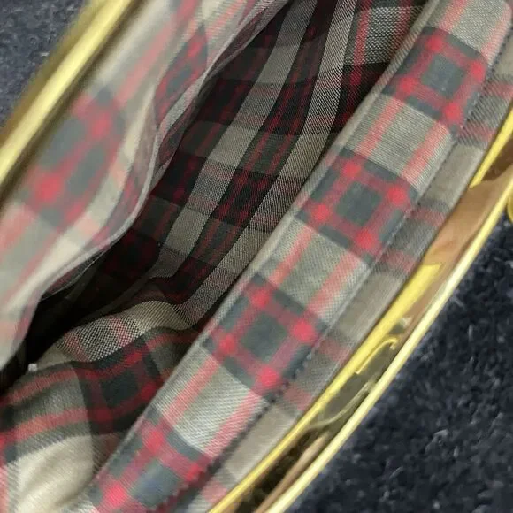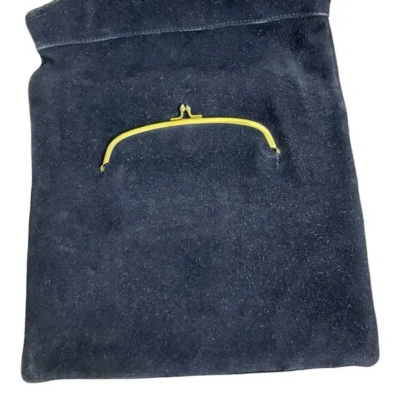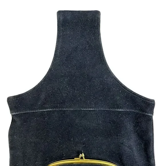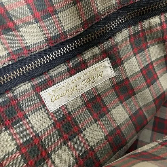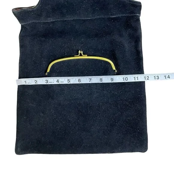 This listing is for a Vintage Coach Bonnie Cashin Carry Suede Sling Kisslock Bag. Black. Gold-toned hardware (with a bit of silver showing through). Small kiss lock pouch on one side / large primary compartment with a small zip pocket on the interior. Plaid lining (cream/red/green) with a logo patch near the interior pocket. Approx 20.75in x 12in.Condition, Good pre-owned vintage condition / some wear to the suede in a few areas and what looks to be a 'drip' on the backside (see photos) / gold-toned coating is worn away a bit on the kiss-lock closure and there are some surface scratches / interior lining at the top strap is worn along the edges but the interior appears to be clean and in good shape. Zipper at the zip pocket tested and working. See photos for exact condition.